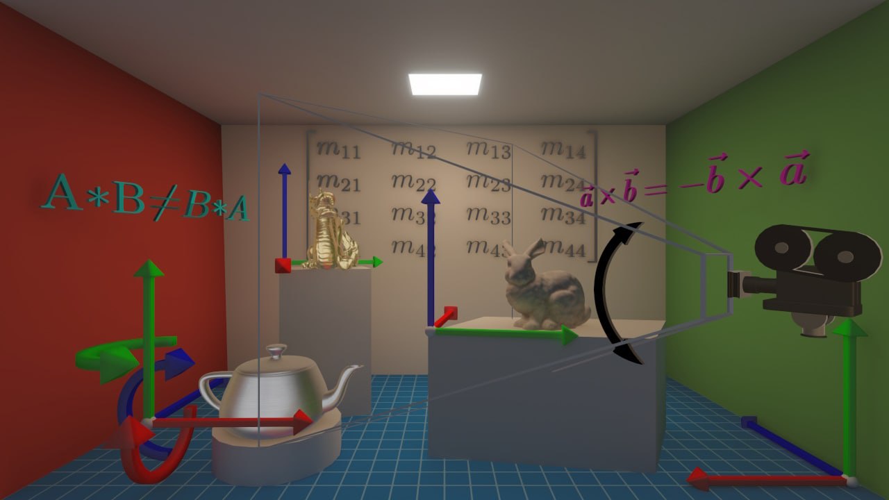 Инженеры из AMD собрали информацию в области трансформации в компьютерной графике в серии статей в блоге. Там про матрицы, их преобразования, нюансы из-за не коммутативности операций (A∗B≠B∗A ) и анти коммутативности (a⃗×b⃗=−b⃗×a⃗).