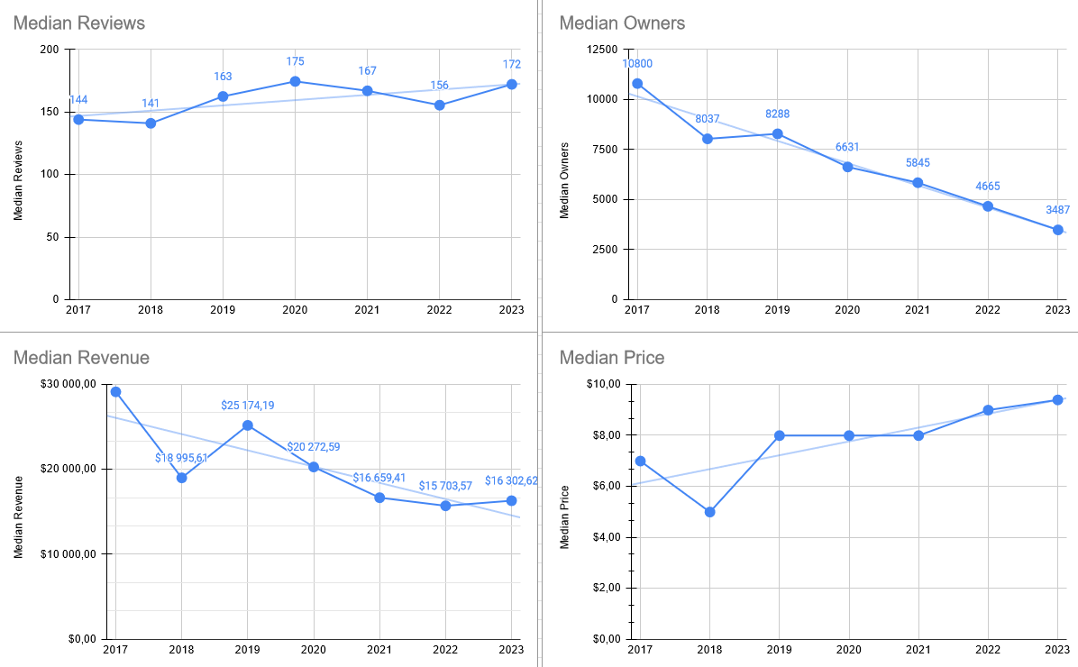 В ней посмотреть различные открытые данные по уже ~65 тысячам игр на платформе, приблизительные данные по популярности и выручкам различных тегов.