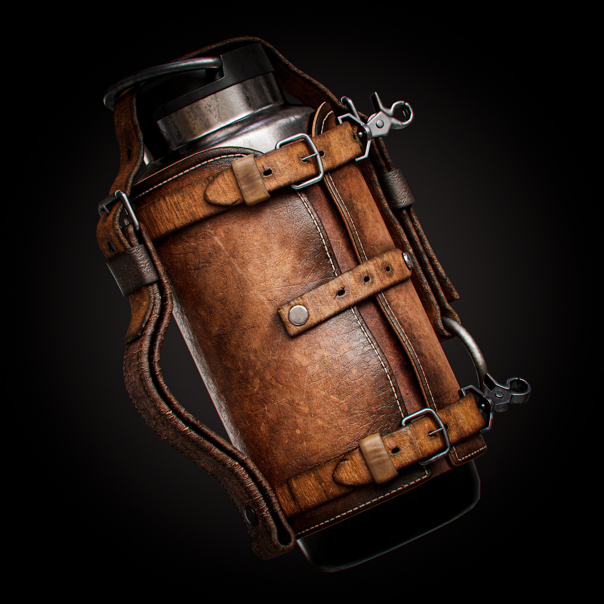 🇬🇧 Металлическая бутылка с потёртым кожаным чехлом в Blender и ZBrush
