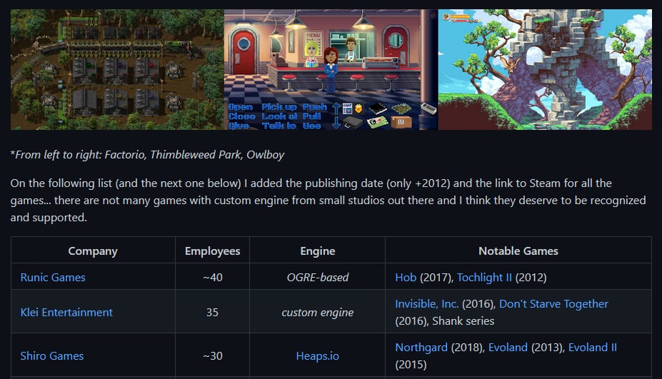 Впервые наткнулся на этот пост со списком существующих кастомных игровых движков, хотя ему уже и больше двух лет. Как следствие, не все движки там есть и где-то уже на самая актуальная информация.
