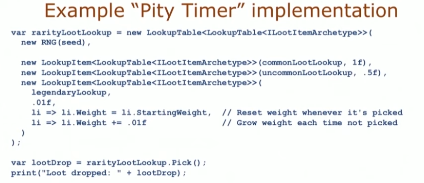 Как вариант реализации Pity Timer он приводит Lookup table, когда вес апается при неудаче, а при успехе вес сбрасывается до дефолтного состояния.