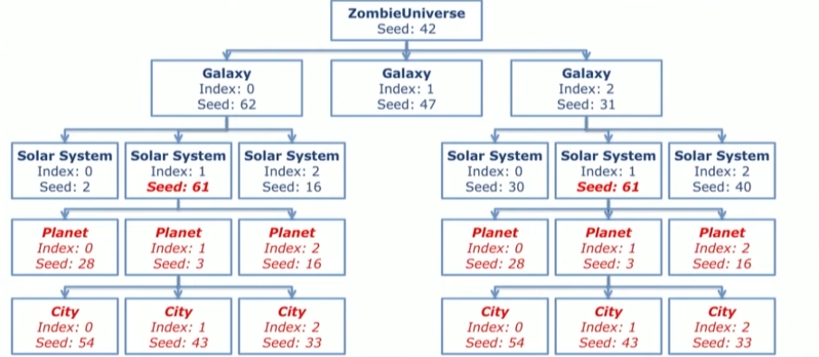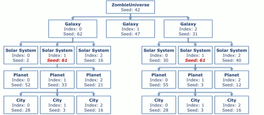 Как пример приводит генератор вселенной, где сид одного уровня генерации используется для генерации нижних уровней. И если на каком-то этапе сид совпадёт, то вы получите одинаковые галактики/солнечные системы/планеты/города, в зависимости от того, на каком уровне произошла коллизия.