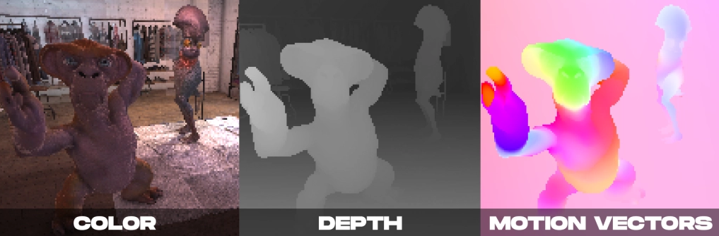 С другой стороны, при рендеринге в реальном времени мы можем получить больше, чем просто цветные изображения, создаваемые камерой. Cовременные движки также предоставляют вспомогательную информацию, такую как значения глубины. Наблюдения показали, что для нейросуперсэмплинга дополнительная вспомогательная информация, предоставляемая моушен векторами, оказалась особенно эффективной. Моушен векторы определяют геометрические соответствия между пикселями в последовательных кадрах. Другими словами, каждый вектор указывает на субпиксельное местоположение, где точка поверхности, видимая в одном кадре, могла появиться в предыдущем кадре. Эти значения обычно оцениваются методами компьютерного зрения для фотографических изображений, но такие алгоритмы оценки подвержены ошибкам. В отличие от этого, механизм рендеринга может непосредственно генерировать плотные моушен векторы, тем самым обеспечивая надежную, полноценную информацию на вход нейросуперсэмплинга, применяемого к контенту.