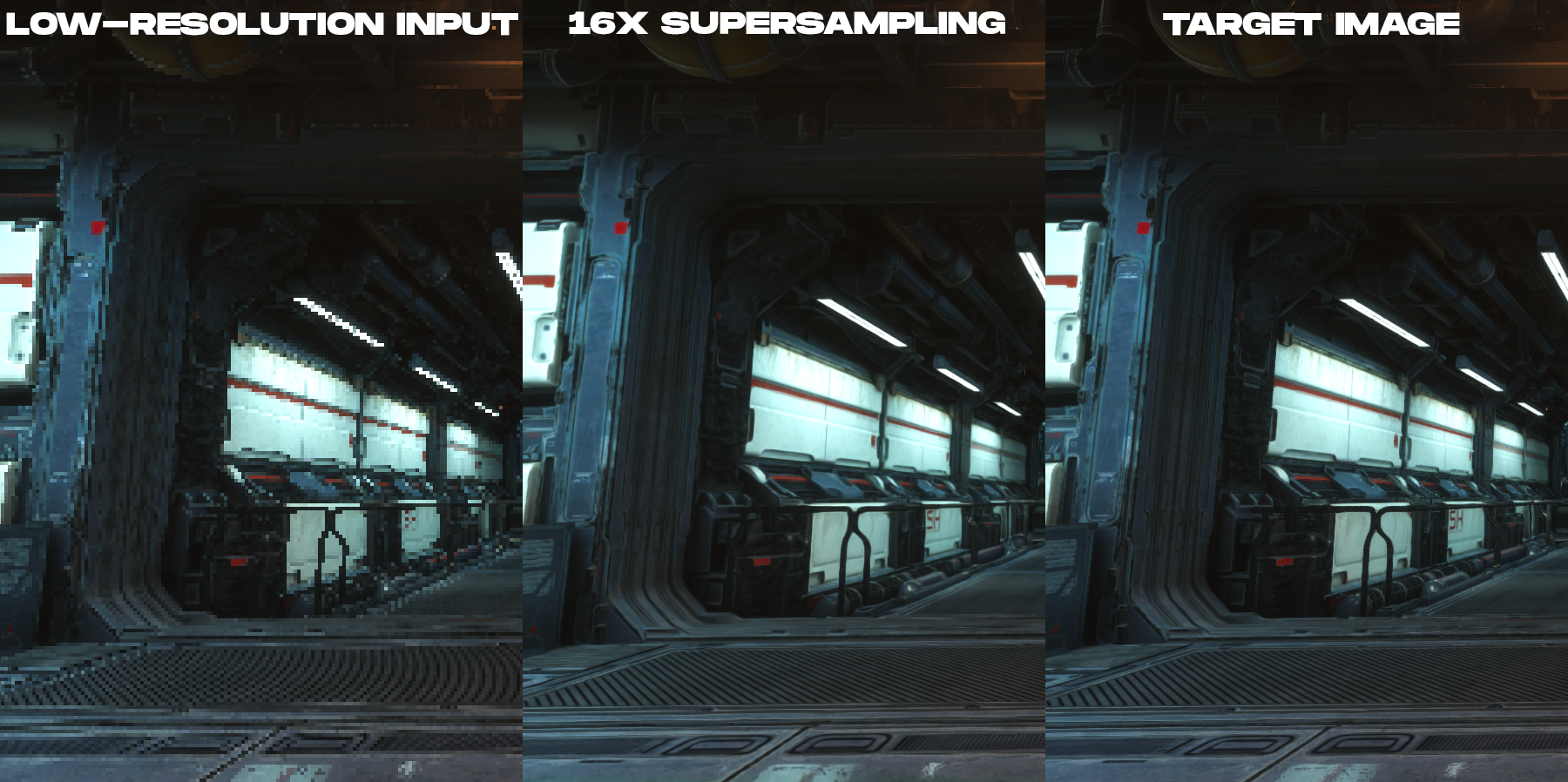 Пример результатов. Слева направо показан отрендеренный цветной ввод с низким разрешением, 16-кратный результат суперсэмплинга с помощью представленного метода и целевое изображение с высоким разрешением, отрендеренное офлайн.
