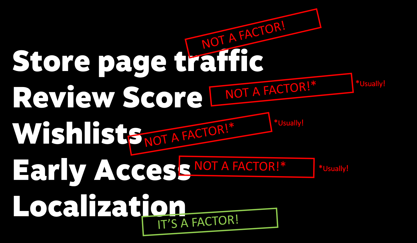 Интересно ещё, что многие факторы не влияют на видимость в Сторе, как многие думали: трафик со страницы игры, оценка, вишлисты, EA. А вот локализация влияет.