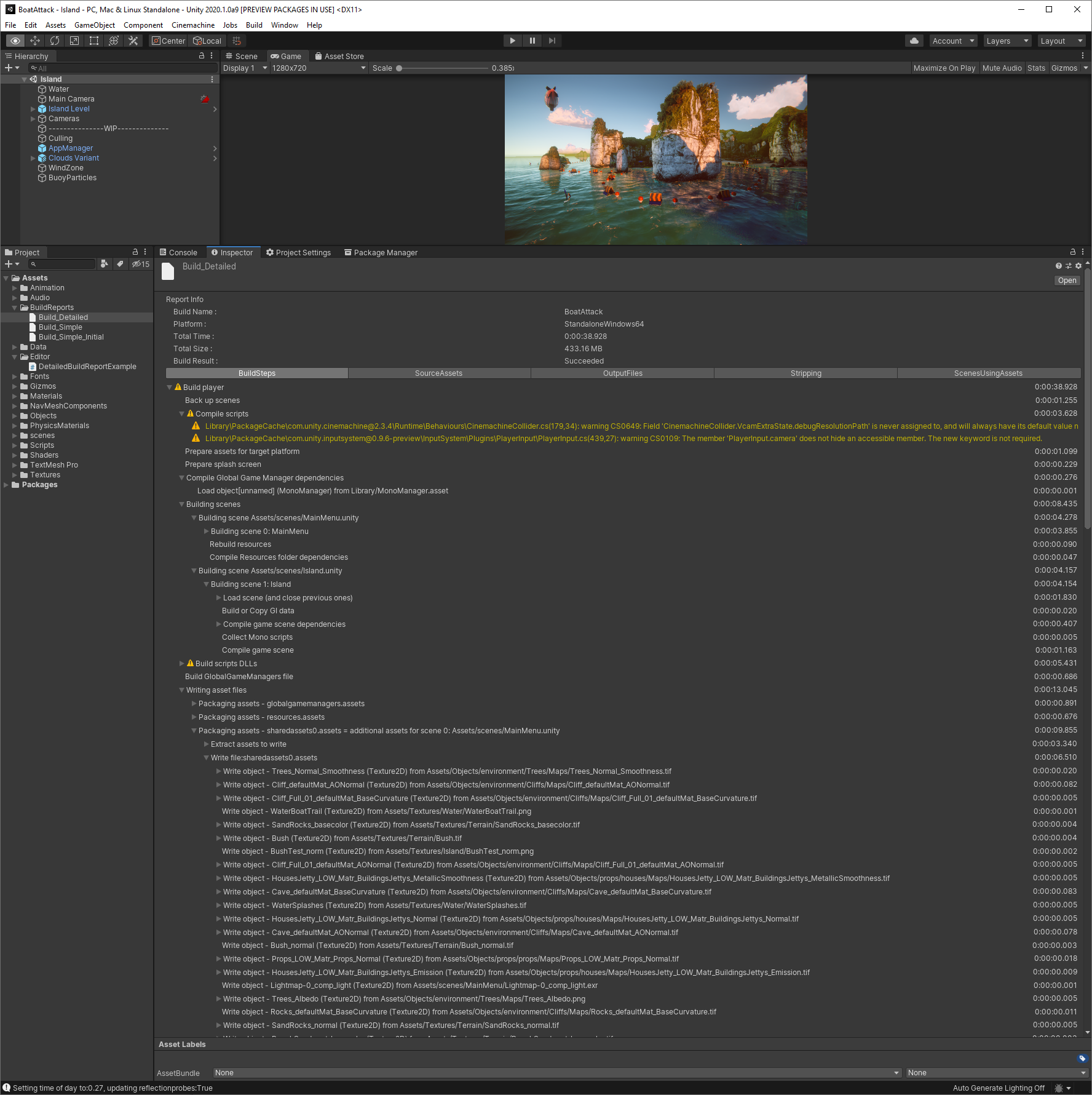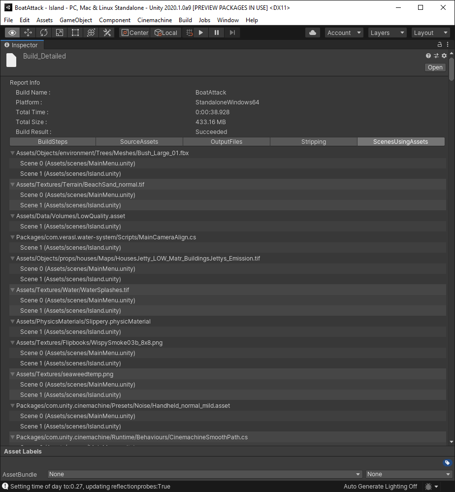 Если мы добавим приведённый выше скрипт в папку Assets/Editor проекта «Boat Attack» и нажмем Build/DetailedBuildReport example пункт в меню, начнётся сборка проекта. В конце сборки дополнительные данные будут включены в отчёт о сборке.