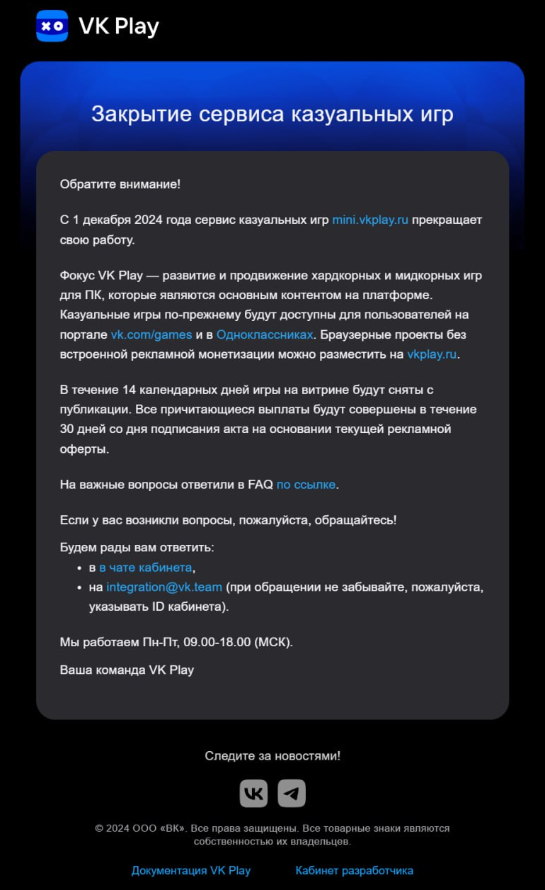 VK play закрывает сервис казуальных игр с 1 декабря 2024