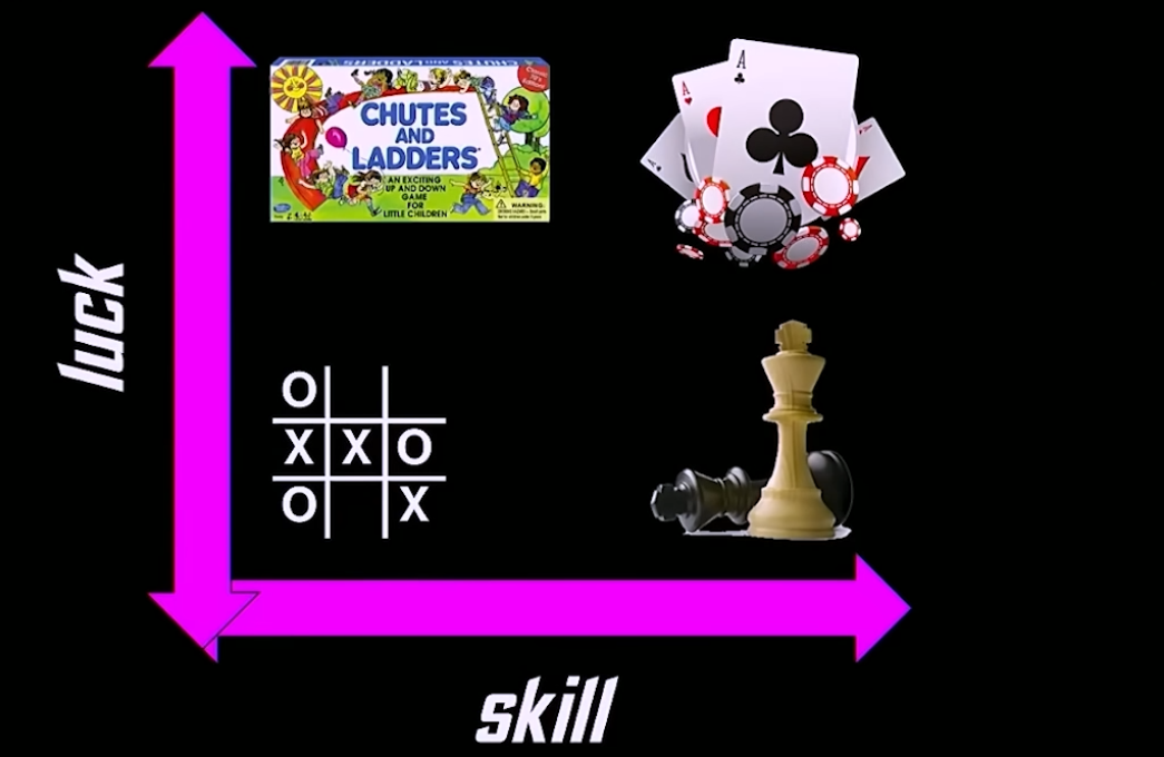 Многие ошибочно считают, что игры находятся на линейной шкале удачи-скилла. Хотя по факту это двумерная история: есть игры, где по большей части всё от удачи зависит, где-то от скилла (шахматы), а где-то и того, и того хватает (покер).
