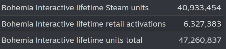 Ну и поделился статистикой продаж Bohemia Interactive: почти 50 миллионов проданных копий 😎