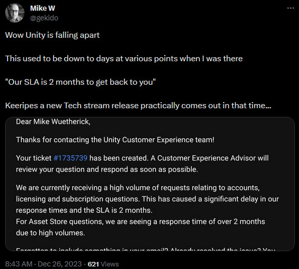 Не первый такой твит от бывших сотрудников Unity (Майк в Юнити много лет проработал как тех. дир), мол «компания разваливается на части». Кейсы, которые раньше закрывались за дни, сейчас резолвятся за месяцы.