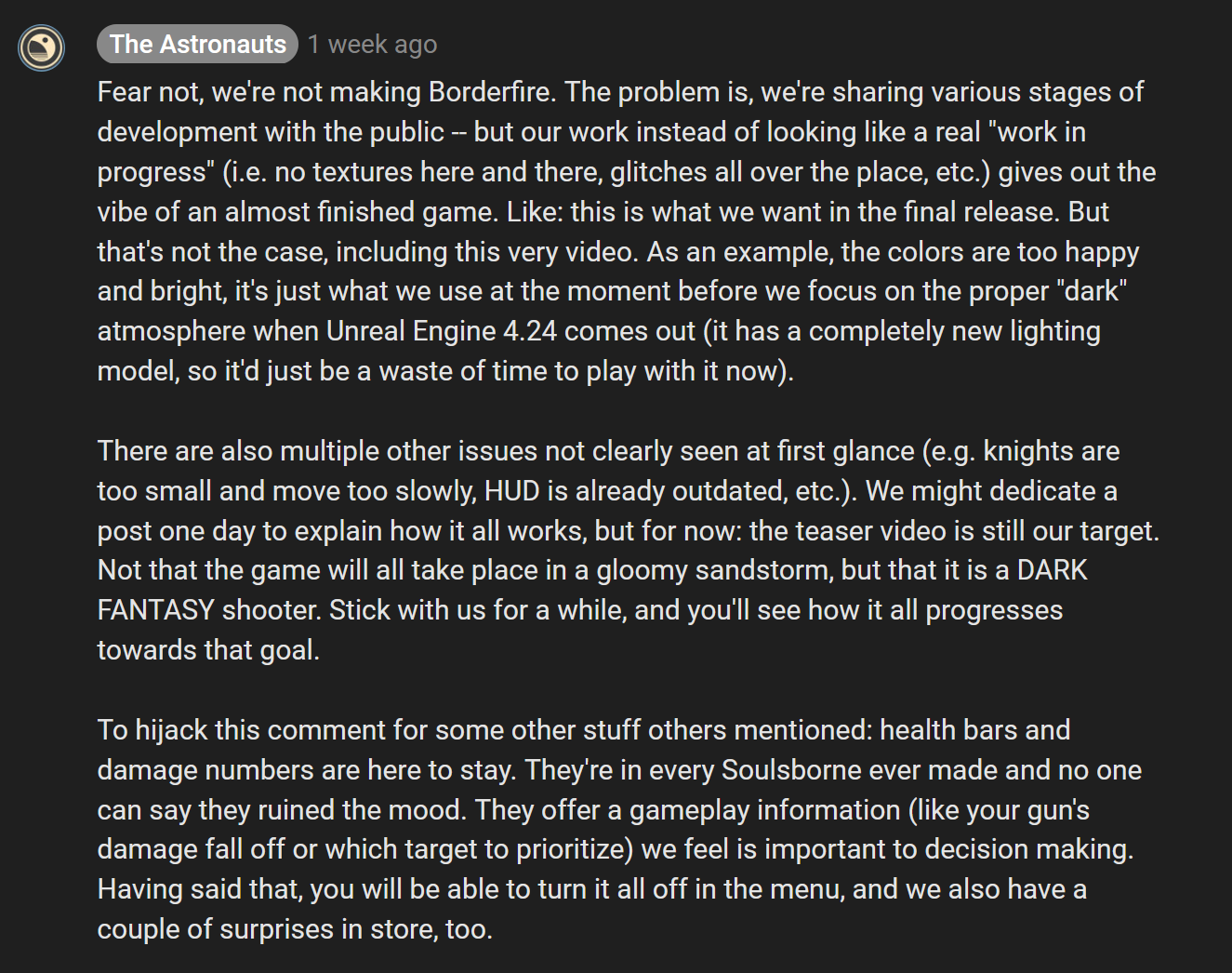 Прежде чем перейти к нему, вернёмся к последнему видео по игре. Видео приняли довольно тепло везде, если не считать YouTube. Там разработчики написали внушительный комментарий: