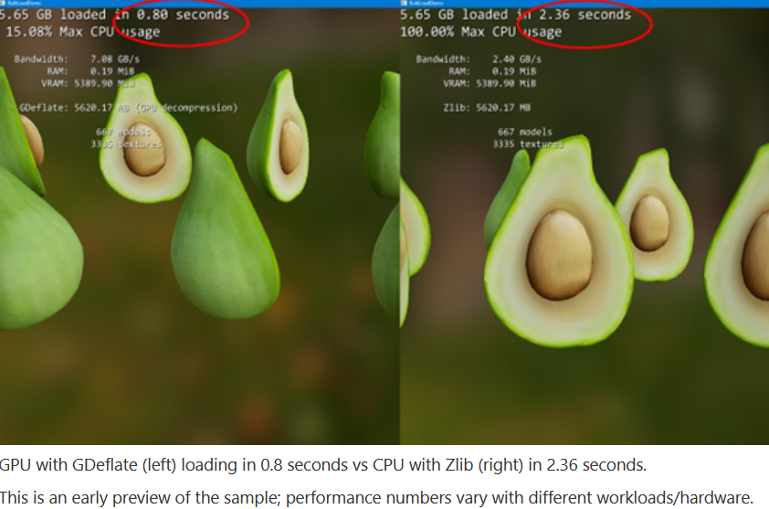 В их примере: распаковка текстур заняла 0.8 сек на GPU с помощью GDeflate против 2.36 сек на CPU с помощью Zlib 🤯