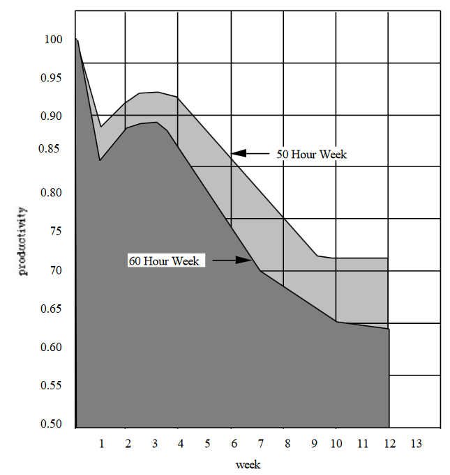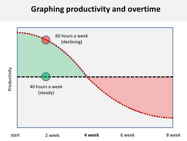 Производительность падает при работе 60 часов в неделю по сравнению с 40-часовой неделей. Первоначально дополнительные 20 часов в неделю компенсируют потерю производительности, и общий объем производства действительно увеличивается. Но в исследовании Business Roundtable говорится, что производительность начинает очень быстро падать при переходе на 60-часовую неделю. Примерно за два месяца совокупная потеря производительности снизилась до такой степени, что проект действительно продвинулся бы дальше, если бы вы просто всё время придерживались 40-часовой рабочей недели.