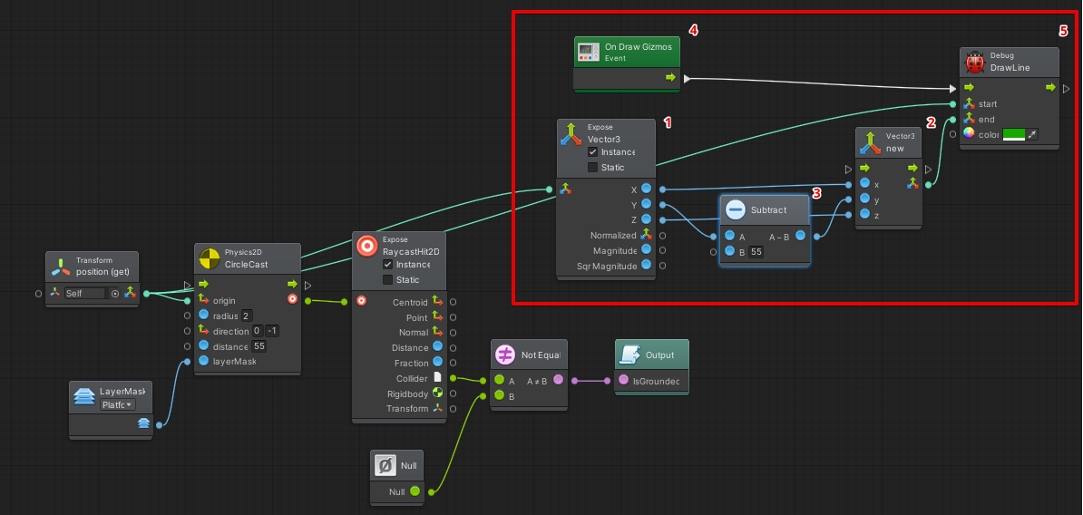 - Результат проверки столкновения луча с платформой пишем в bool переменную IsGrounded на выход.