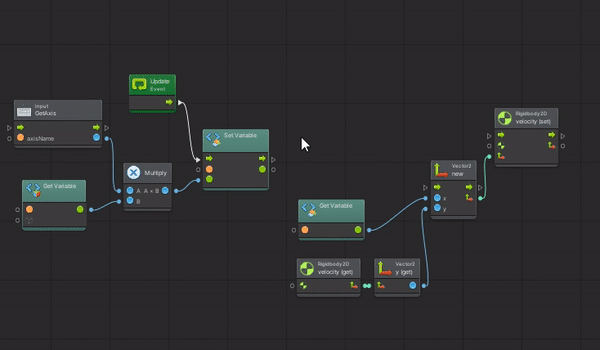 - Полученный вектор передаём на вход узлу для установки нового значения скорости (Codebase > Unity Engine > Rigidbody 2D -> Set Velocity).