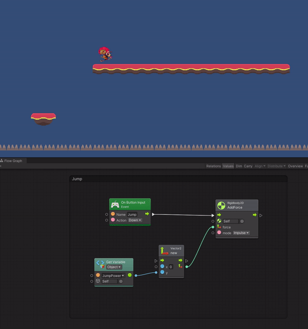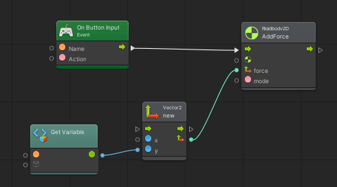 - Вместе со считанной силой прыжка передаём в Codebase > Unity Engine > Rigidbody 2D > Add Force (Force, Mode).
