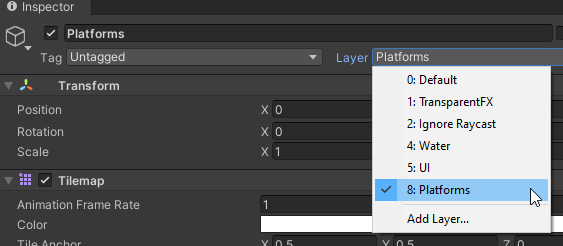 Создадим новый слой и назначим его платформам.