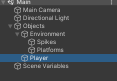Накидаем простенькую сцену с платформами и шипами. Я использовал редактор Тайлов, но это могут быть и обычные спрайты с колайдерами на них. Добавляем в иерархию GameObject игрока.