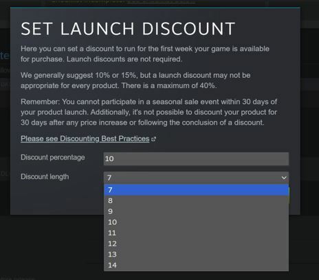 Разработчики Steam теперь могут выбирать, как долго они хотят, чтобы скидка оставалась активной, выбрав продолжительность от 7 до 14 дней. Раньше скидку при запуске можно было использовать только в течение одной недели.