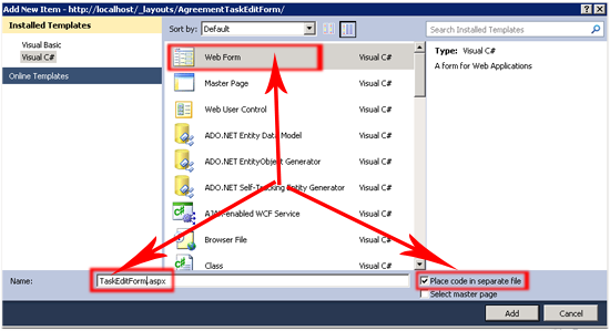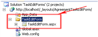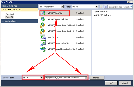 Открываем Visual Studio (я использую Visual Studio 2010)— Открываем “File Menu”— Выбираем “New”— Выбираем “Web Site”— Выбираем “ASP.NET Web Site” — Меняем тип на HTTP (это очень важно)— Выбираем местоположение: http://localhost/_layouts/AgreementTaskEditForm.IIS скопирует ваши файлы в директорию C:\Program Files\Common Files\Microsoft Shared\Web Server Extensions\14\TEMPLATE\LAYOUTS