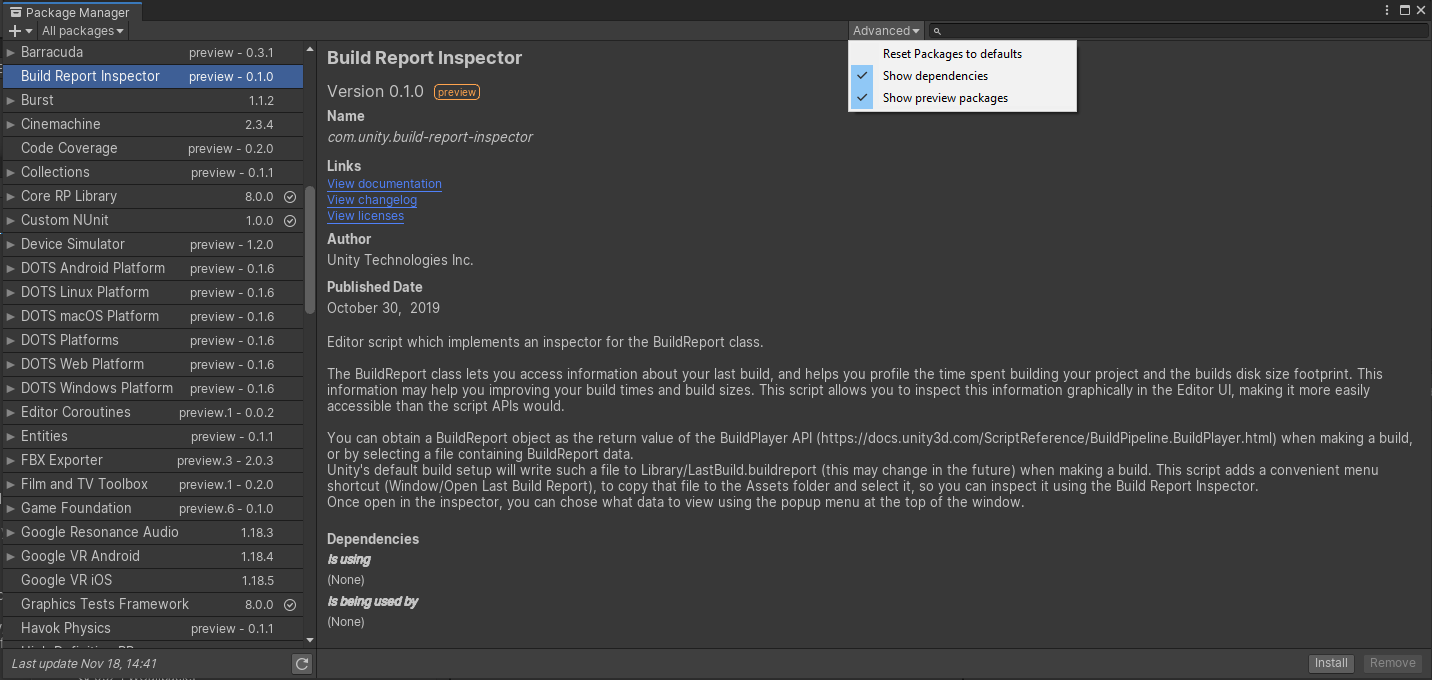 Build Report Inspector можно добавить в проект из окна диспетчера пакетов Unity. Установите флажок Show Preview Package в меню Advanced и найдите Build Report Inspector в списке. Наконец, нажмите кнопку Install.