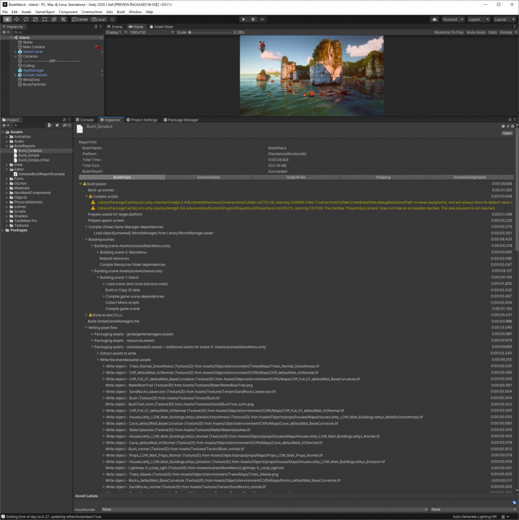 Если мы добавим приведённый выше скрипт в папку Assets/Editor проекта «Boat Attack» и нажмем Build/DetailedBuildReport example пункт в меню, начнётся сборка проекта. В конце сборки дополнительные данные будут включены в отчёт о сборке.