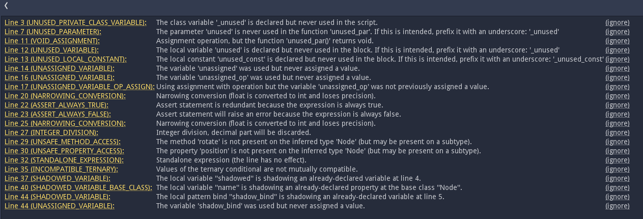 Некоторые предупреждения были удалены, поскольку они не применимы к новому синтаксису GDScript. Например, о возможности yield, который больше не является проблемой, поскольку ключевое слово заменено на await. Были добавлены новые, например, предупреждение о неиспользованных локальных константах.