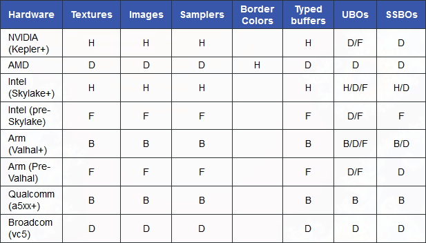 В статье представлено описание модели привязки текстуры/буфера/сэмплера, поддерживаемой разными производителями оборудования. Рассматрено как модели Vulkan и D3D12 сопоставляются с оборудованием.