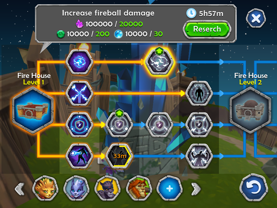 Игровой цикл в целом выглядит так: 1) Для прокачки спеллов нужны свитки, которые падают из сундуков. Сундуки можно получить различными бесплатными способами (за лигу, за победу в Бэтл Рояле и т.п.) или купить.2) Чтоб прокачать спелл, нужно построить и улучшить здание героя до определённого уровня.3) Для улучшения здания героя нужно улучшать другие здания (главное здание, алтарь и т.д.).Т.е., мы пытались как-то увязать режим планеты и арен. Вероятно, мы делали всё не так.