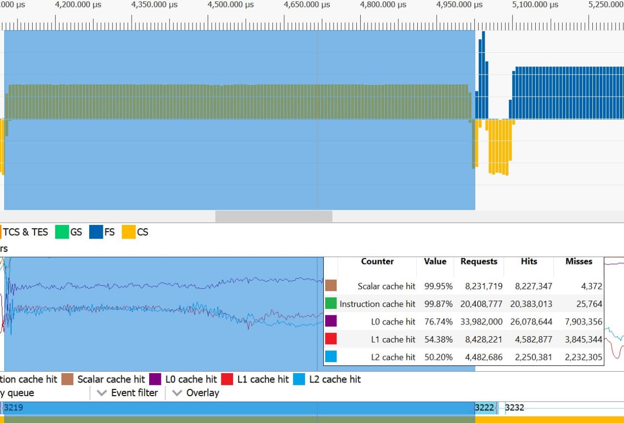 - Было внесено несколько незначительных улучшений по части Cache Counters, представленных в предыдущем выпуске. Ранее эта функция поддерживалась только для приложений с DirectX 12 и Vulkan. В RGP v1.11 эта функция теперь также доступна для OpenCL.