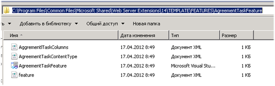 — Необходимо установить:stsadm.exe -o installfeature -name AgreementTaskFeatureПримечание: для удаление:stsadm -o uninstallfeature -name AgreementTaskFeature -force— Далее необходимо активировать:stsadm -o activatefeature -name AgreementTaskFeature -url http://localhost Примечание: для деактивации:stsadm -o deactivatefeature -name AgreementTaskFeature -url http://localhost -force