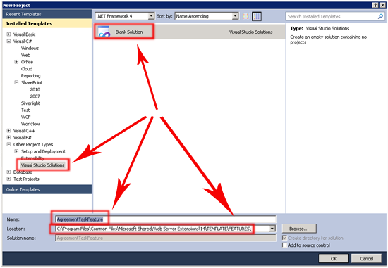 Открываем Visual Studio (я использую Visual Studio 2010)— Открываем “File Menu”— Выбираем “New Project”— Выбираем “Visual Studio Solutions”— Выбираем “Blank Solution”— Выбираем местоположение: папка FEATURES вашего SharePoint ServerУ меня это:C:\Program Files\Common Files\Microsoft Shared\Web Server Extensions\14\TEMPLATE\FEATURES\