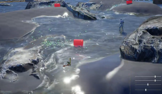 Mesh distance field отталкивает воду. 100 м, симуляция 2K, 260 FPS на RTX3080