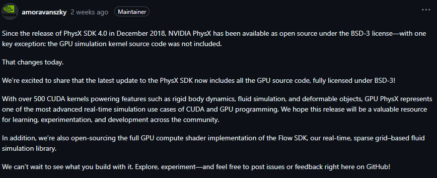 PhysX SDK и так уже был в опенсорсе по BSD-3, но исходный код ядра симуляции не был выложен. Но теперь всё меняется к лучшему.