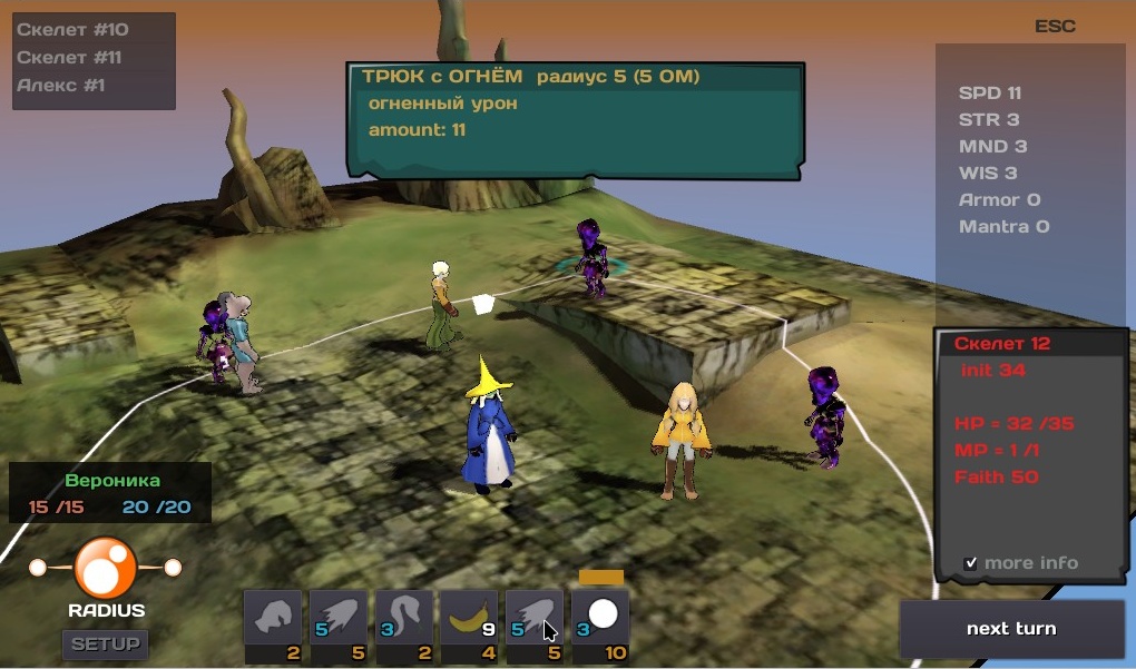 Прототип походовой радиусной тактики на движке Godot 3x, продвинувшийся от концепта до улучшающейся демоверсии. Передвижение персонажей, как и применение способностей, происходит не по клеткам, а в пределах определённого радиуса. Герои могут менять профессии — на данный момент это Странник, Волшебник, Сказочник или Рыцарь.