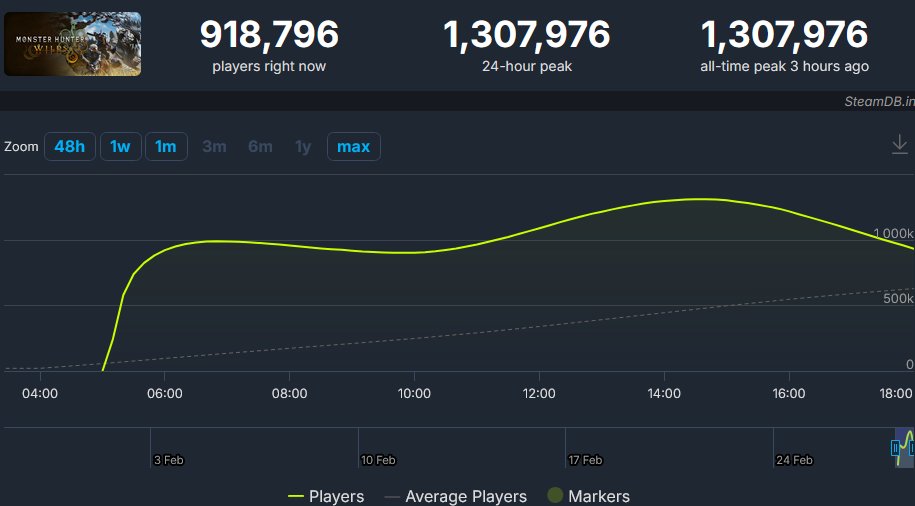 Онлайн Monster Hunter Wilds превысил 1.3 миллиона одновременных игроков в Steam