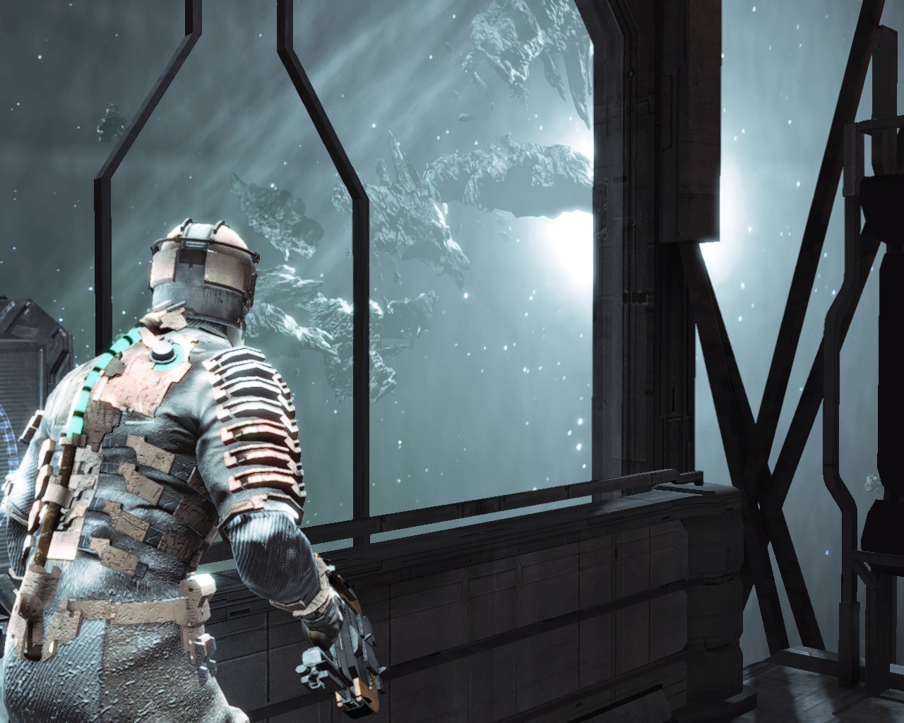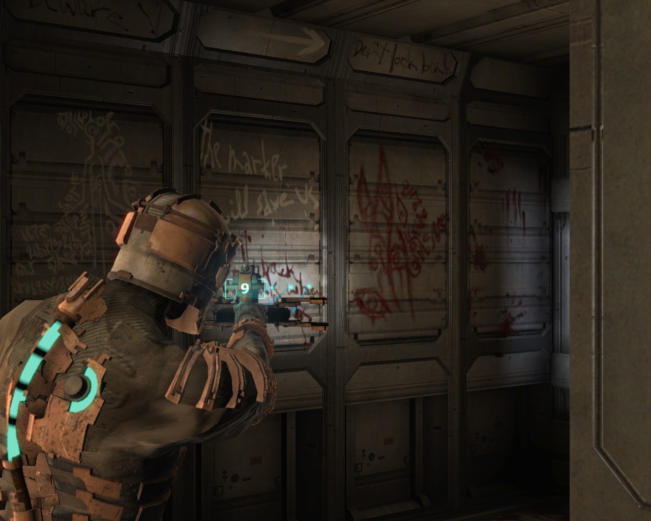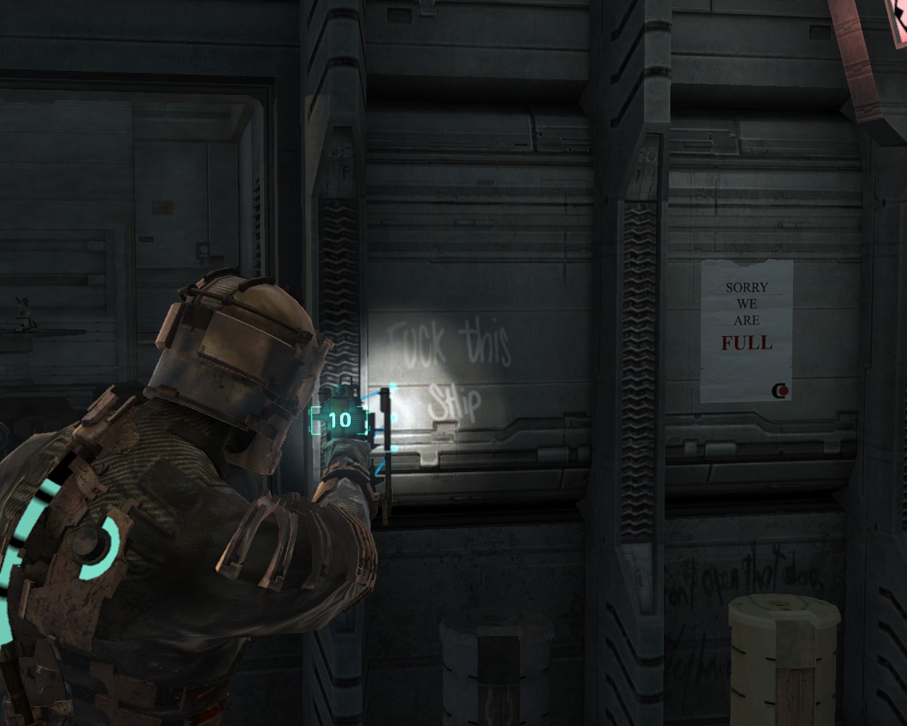 Действие игры проходит на космическом корабле (впрочем, и в открытый космос придётся пару раз выходить). Когда начинал гамать, предчувствовал коридоры узкие, однообразные локации и кучу треша. Был приятно удивлён. Все локации Dead Space отличаются друг от друга. Попадаю в ту или иную локацию, сразу понимаешь, где находишься. Дизайнеры неплохо над интерьерами и текстурами постарались — корабль действительно кажется настоящим. Прекрасный антураж и пейзажи. Я обычно не люблю скринить игры, но в этом раз вдоволь поскринил :D