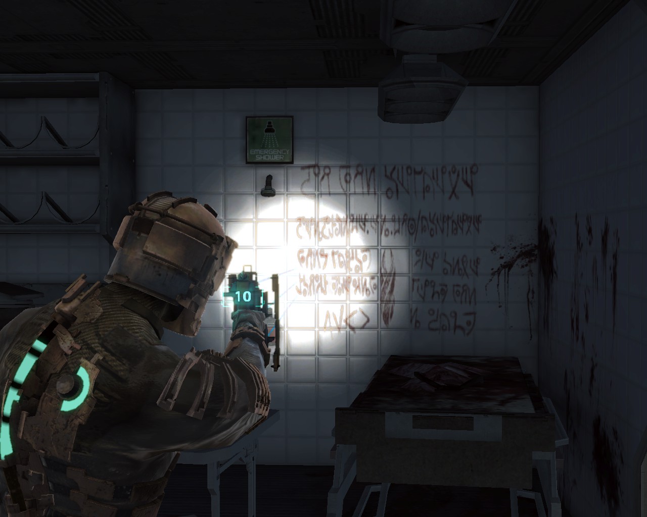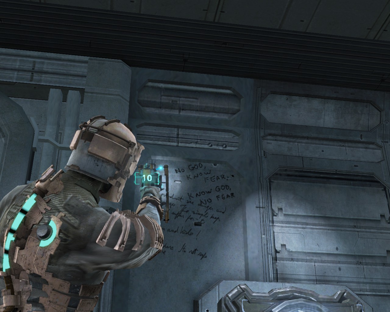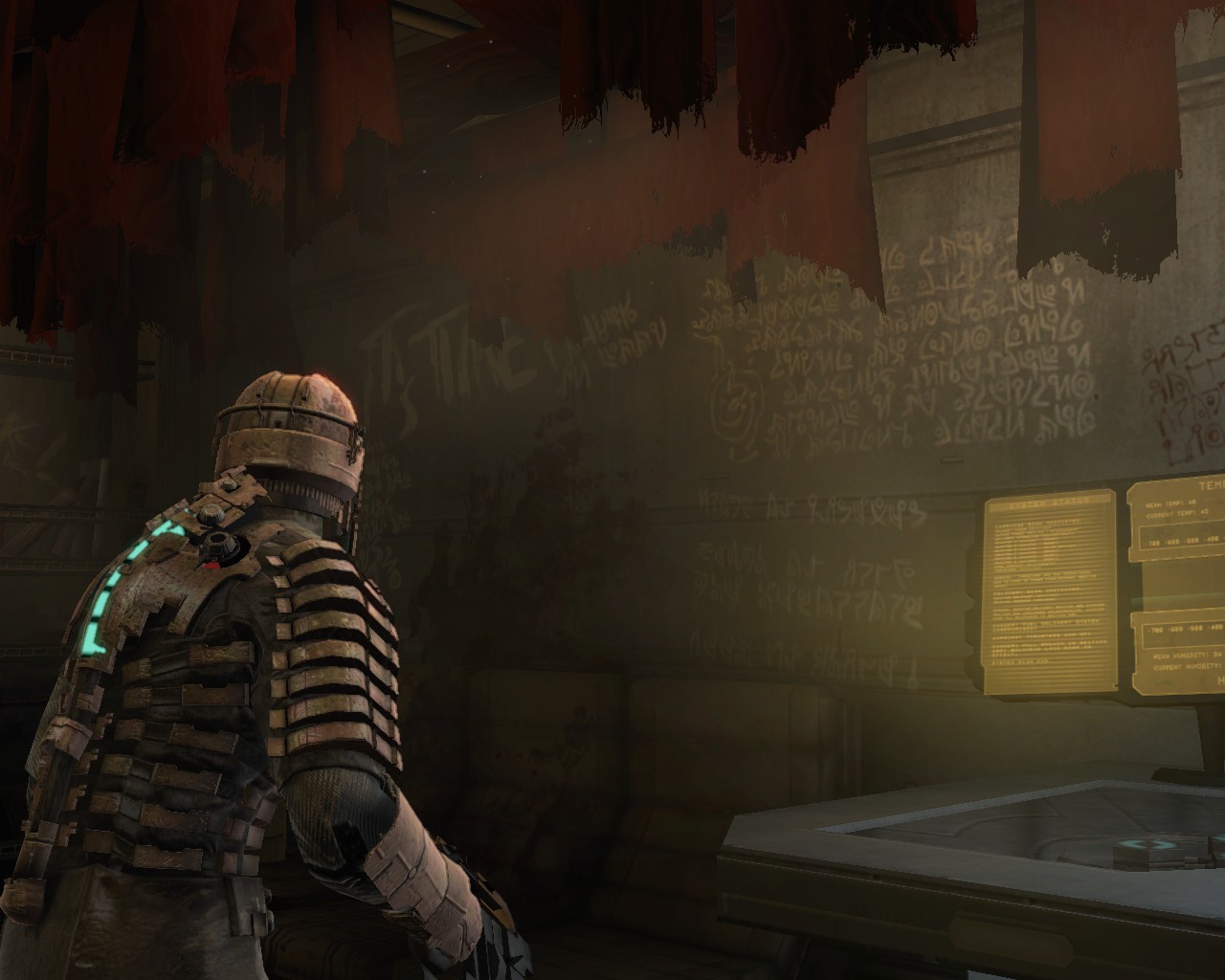 Действие игры проходит на космическом корабле (впрочем, и в открытый космос придётся пару раз выходить). Когда начинал гамать, предчувствовал коридоры узкие, однообразные локации и кучу треша. Был приятно удивлён. Все локации Dead Space отличаются друг от друга. Попадаю в ту или иную локацию, сразу понимаешь, где находишься. Дизайнеры неплохо над интерьерами и текстурами постарались — корабль действительно кажется настоящим. Прекрасный антураж и пейзажи. Я обычно не люблю скринить игры, но в этом раз вдоволь поскринил :D