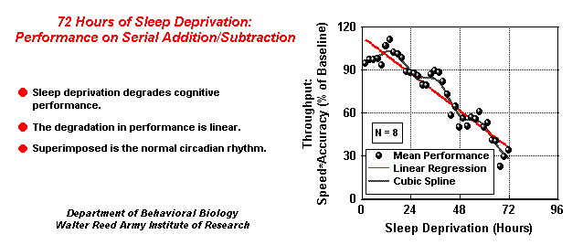 Полковник Грегори Беленький, директор отдела нейропсихиатрии армейского научно-исследовательский институт имени Уолтера Рида, проводит исследования для Пентагона по повышению продуктивности и боевой готовности солдат в боевых условиях. В своей статье 1997 года «Сон, депривация сна и деятельность человека в непрерывных операциях» он пишет[28], что умственная работа снижается на 25% в течение каждых 24 часов непрерывного бодрствования. Люди, лишенные сна, могут сохранять точность при выполнении когнитивных задач, но скорость снижается по мере увеличения времени бодрствования.