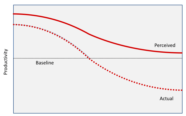 По сути, производительность труда со временем снижается. Рабочий, который создаёт 10 виджетов в час в начале смены, может производить только 6 в час в конце смены, достигнув пика на уровне 12 в час через пару часов после начала рабочего дня. Со временем он работает медленнее, и делает больше ошибок. Эта комбинация замедления и ошибок в итоге достигает точки нулевой производительности, когда создание каждого виджета занимает очень много времени, а каждый последующий каким-то образом портится. Когда достигается такой уровень усталости, возрастает риск серьёзных аварийных ситуаций, ведущих к большим и дорогостоящим убыткам.