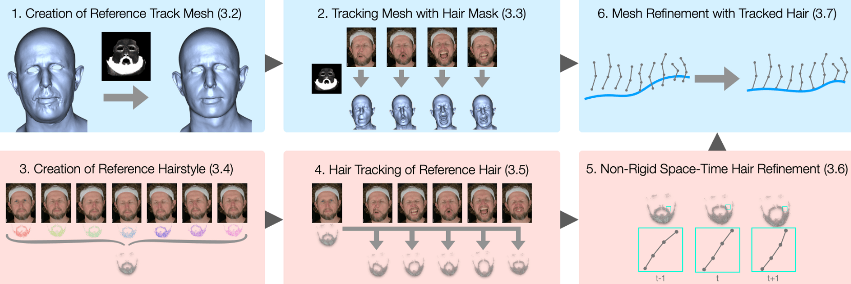 1. Для заданного объекта съёмки алгоритм сначала реконструирует высококачественную трёхмерную бороду путём регистрации более разреженных реконструкций волос по нескольким кадрам, изображающих нейтральное лицо в квазижёстком движении.