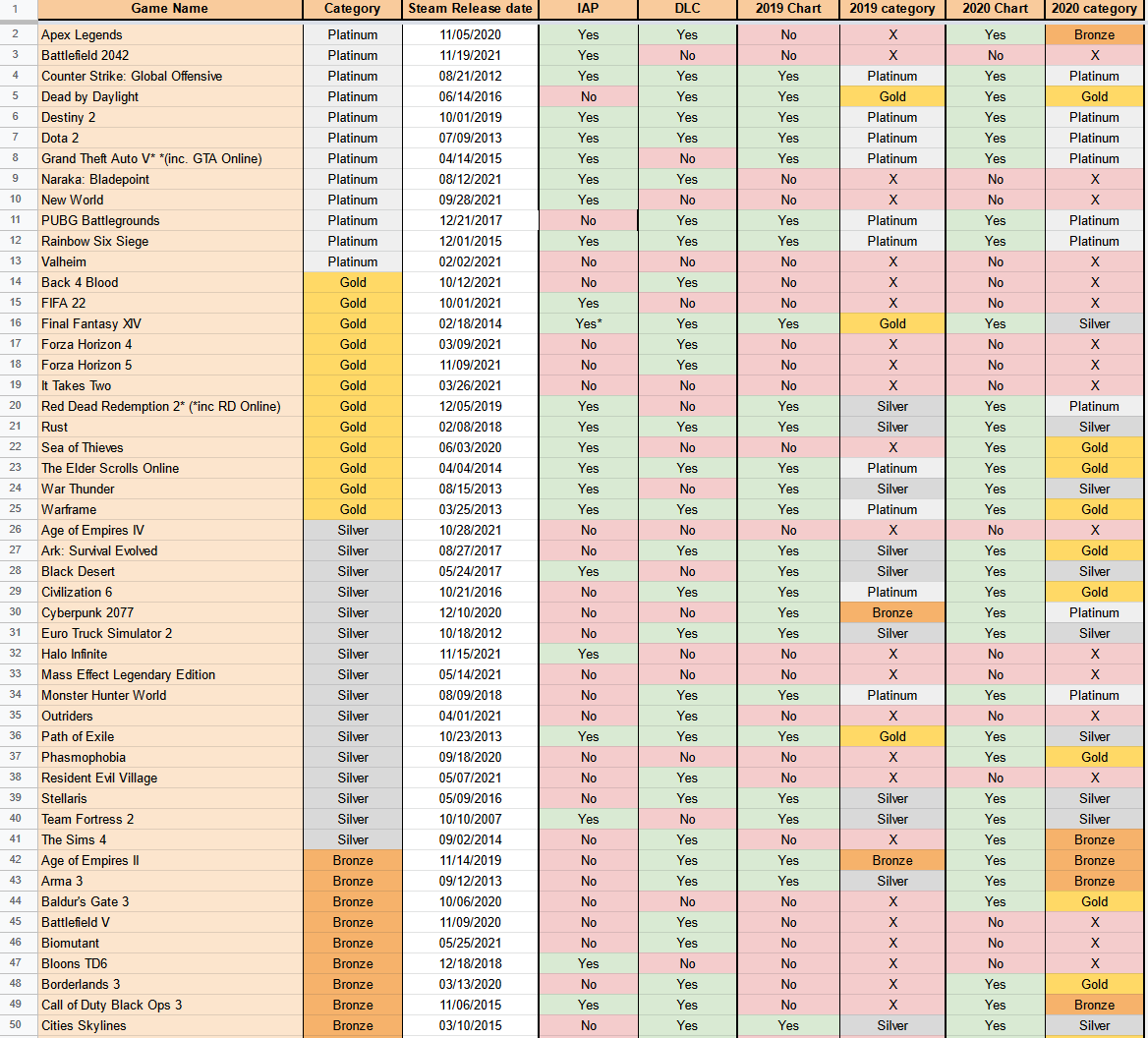 • 13 из 24 игр из топа попали в топ-100 в 2019 году. А 15 из 24 лучших игр также попали в чарты 2020 года. Если не брать в расчёт Forza Horizon 4, то из 2021 года в топ попало 8 игр: Battlefield 2042, Naraka: Bladepoint, New World, Forza Horizon 5, Valheim, Back 4 Blood, FIFA 22 и It Takes Two.