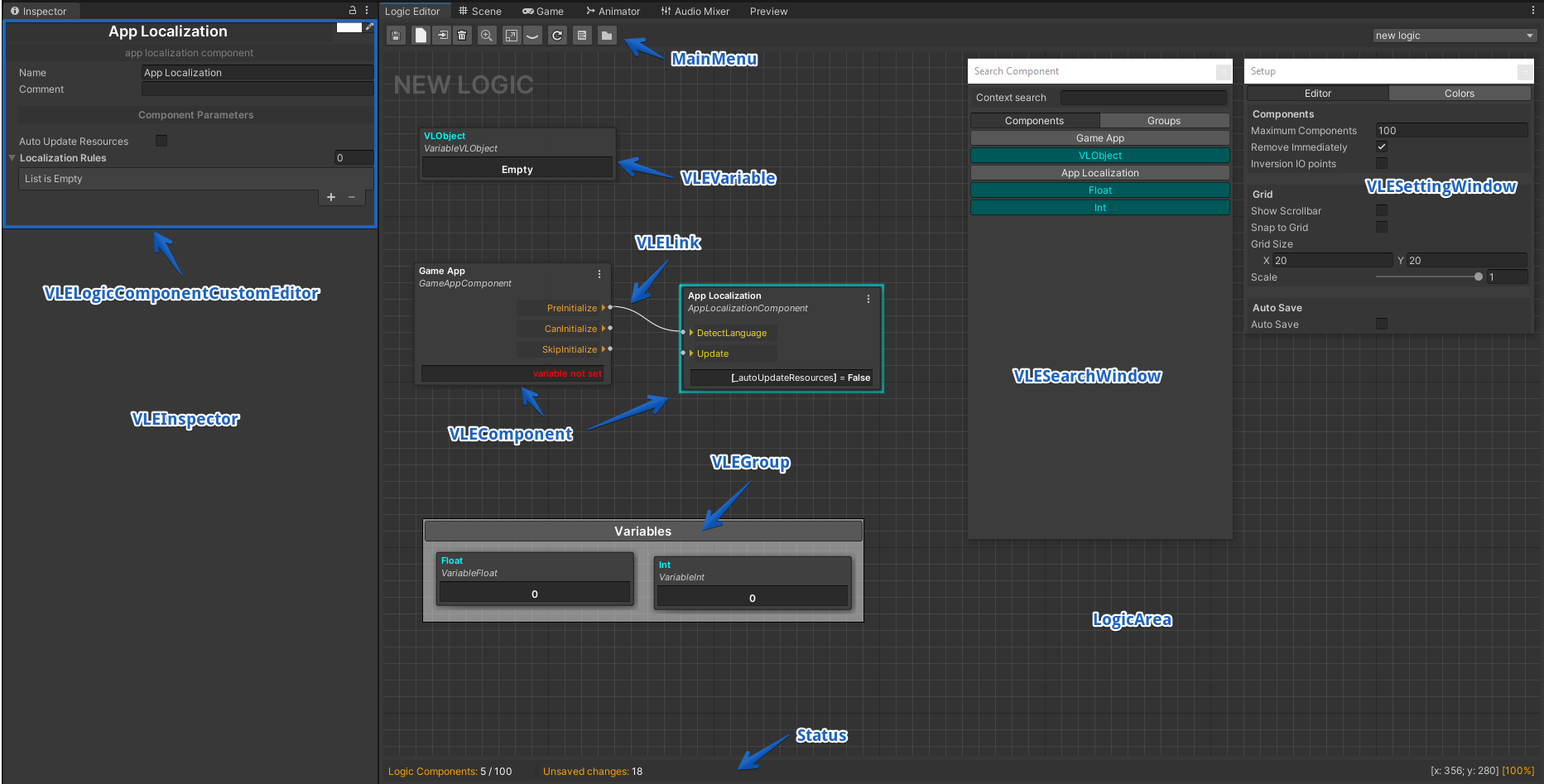 В завершающей статье речь идёт именно о редакторе Unity. Данный аспект всей системы в целом является наиболее сложным и обширным, в том числе и по реализации. Автор постарался раскрыть все основные моменты архитектуры, а также те решения, которые он использовал для создания таких вещей, как рисование связей, компонентов, инспектора и т. п.