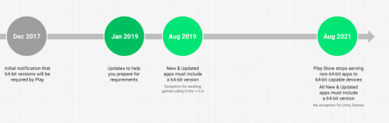Google установил 1 августа 2019 года крайним сроком для перехода на 64-битную версию приложений. В настоящее время Corona поддерживает создание лишь 32-битных версий. Команда инженеров работает над преобразованием процесса сборки для поддержки 64-битных приложений Corona, но это очень сложный процесс. Приложения для iOS уже 64-битные.