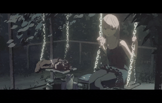 Девушка на качелях в безмятежной аниме-сцене, созданной в Blender