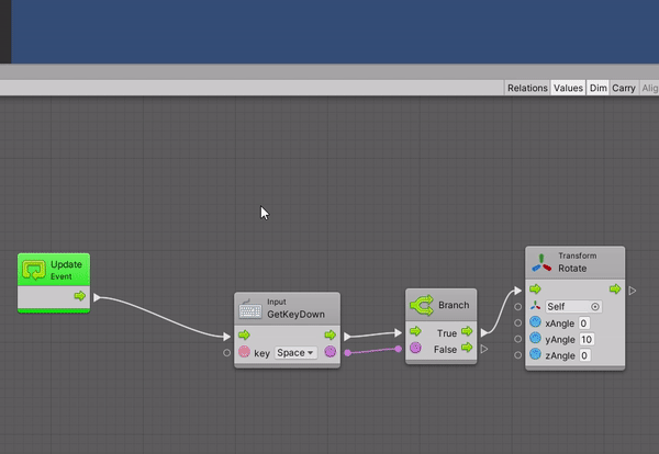 ​Поменяем поведение — сделаем, чтобы вращение было лишь по нажатию на клавишу. Для этого нужно добавить узел Input.GetKeyDown, а от него узел Branch, от которого пойдёт два ответвления (в зависимости от состояния — нажали или нет кнопку).