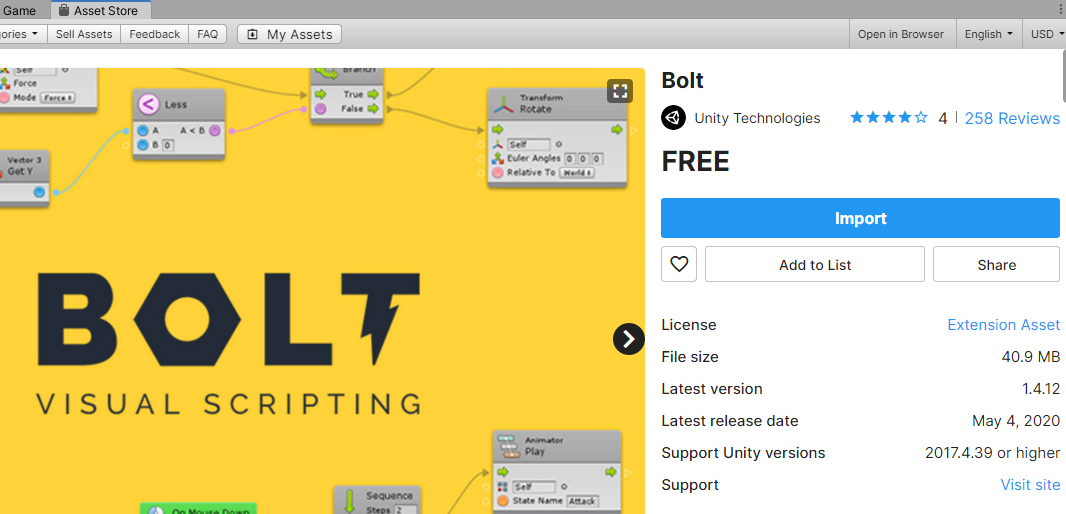 ​Для начала нужно установить плагин. Открываем в редакторе Asset Store: Window -> Asset Store (Ctrl + 9). Там находим Bolt и импортируем в проект.