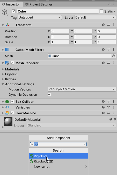 ​Выбираем объект и в инспекторе добавляем к нему компонент Flow Machine.