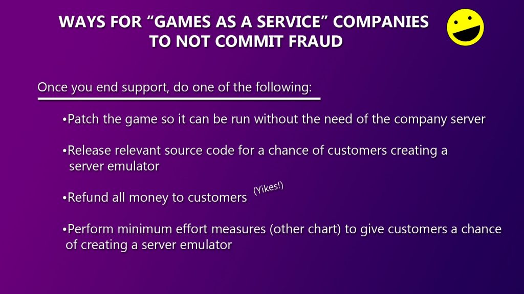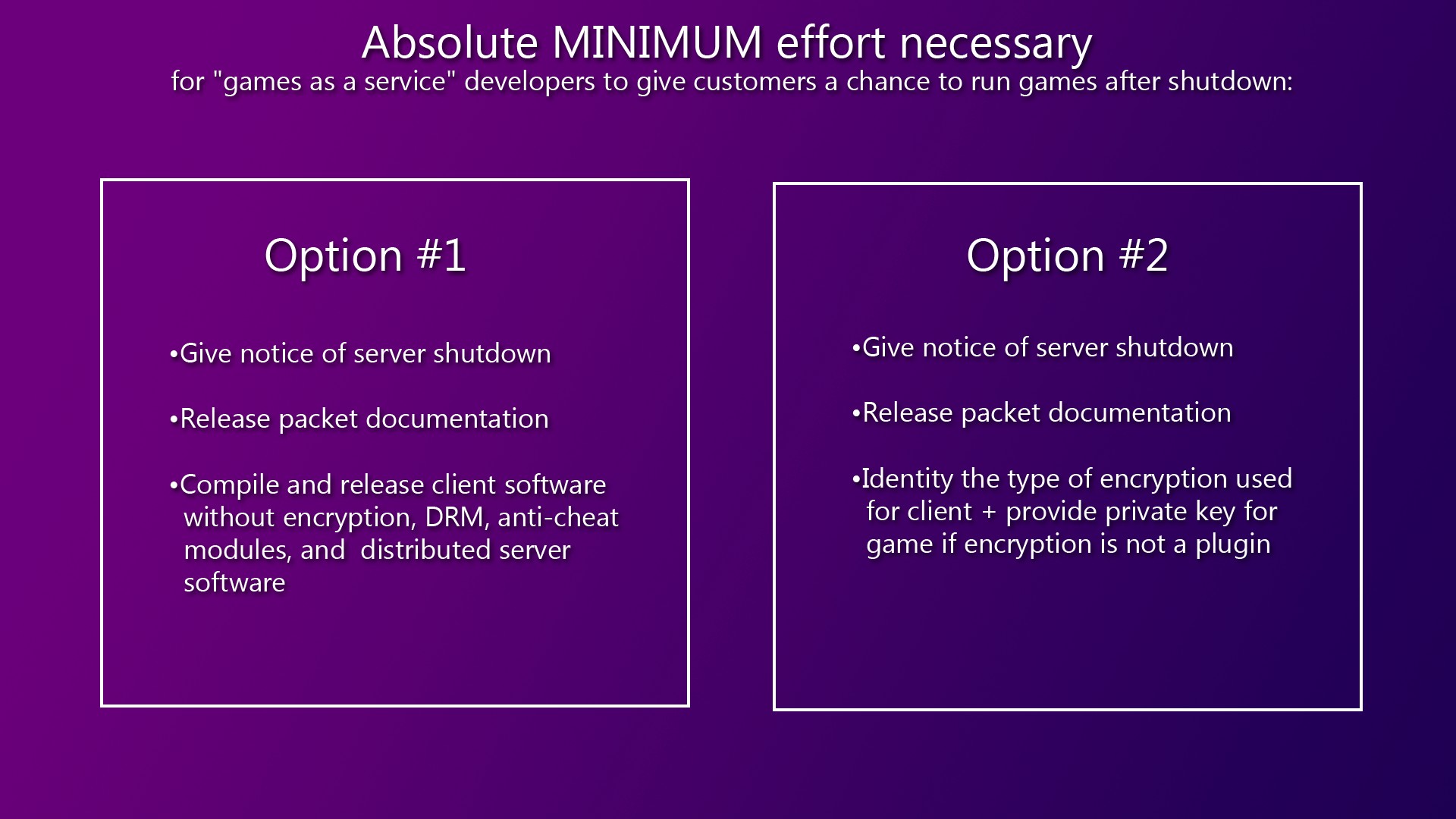 И я не говорю, что нужно предоставлять серверный код пользователям. Я говорю о том, что нужно предоставить пользователю возможность запускать игру, за которую они заплатили. То, как компания реализует эту возможность – их дело.