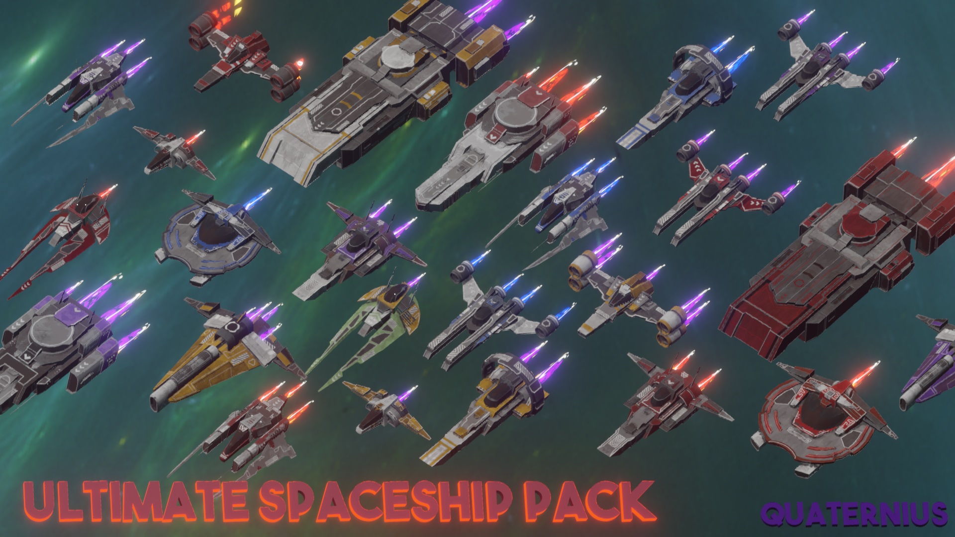 Доступно 10 кораблей в FBX, OBJ, glTF и Blend. Каждый космический корабль имеет 5 цветовых вариаций.